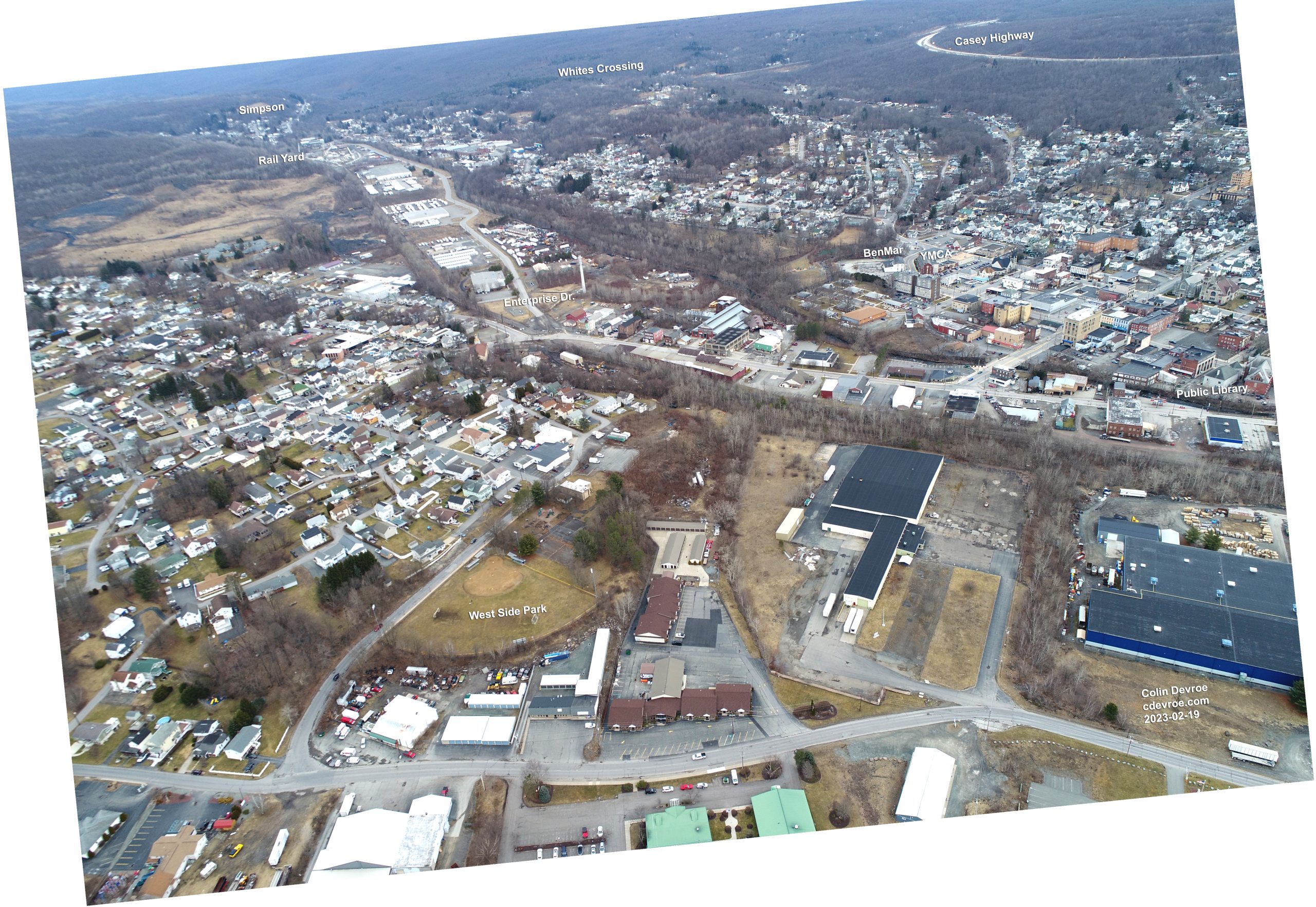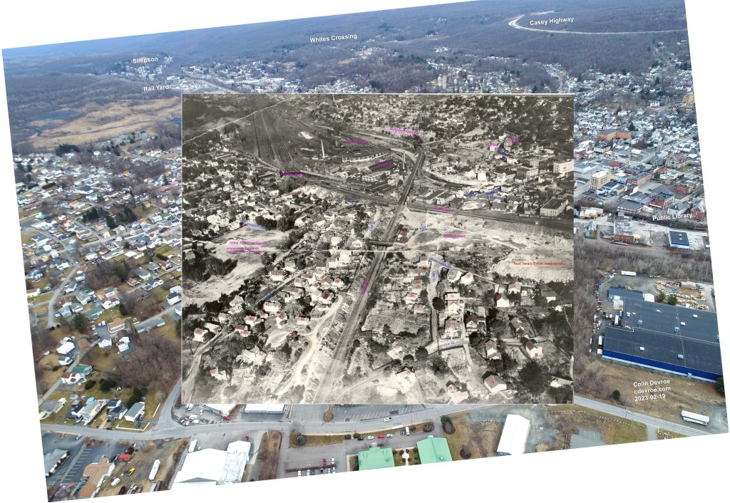 Sometime near 1948 Fiore Cerra took an aerial photograph of Carbondale, Pennsylvania that captured how very different a place it was just 75 years ago or so. I live near Carbondale and the moment I saw Cerra’s aerial I knew I wanted to try to recreate it. Well, in early 2023 I did and I uploaded a quick comparison of the two images to Instagram at the time.